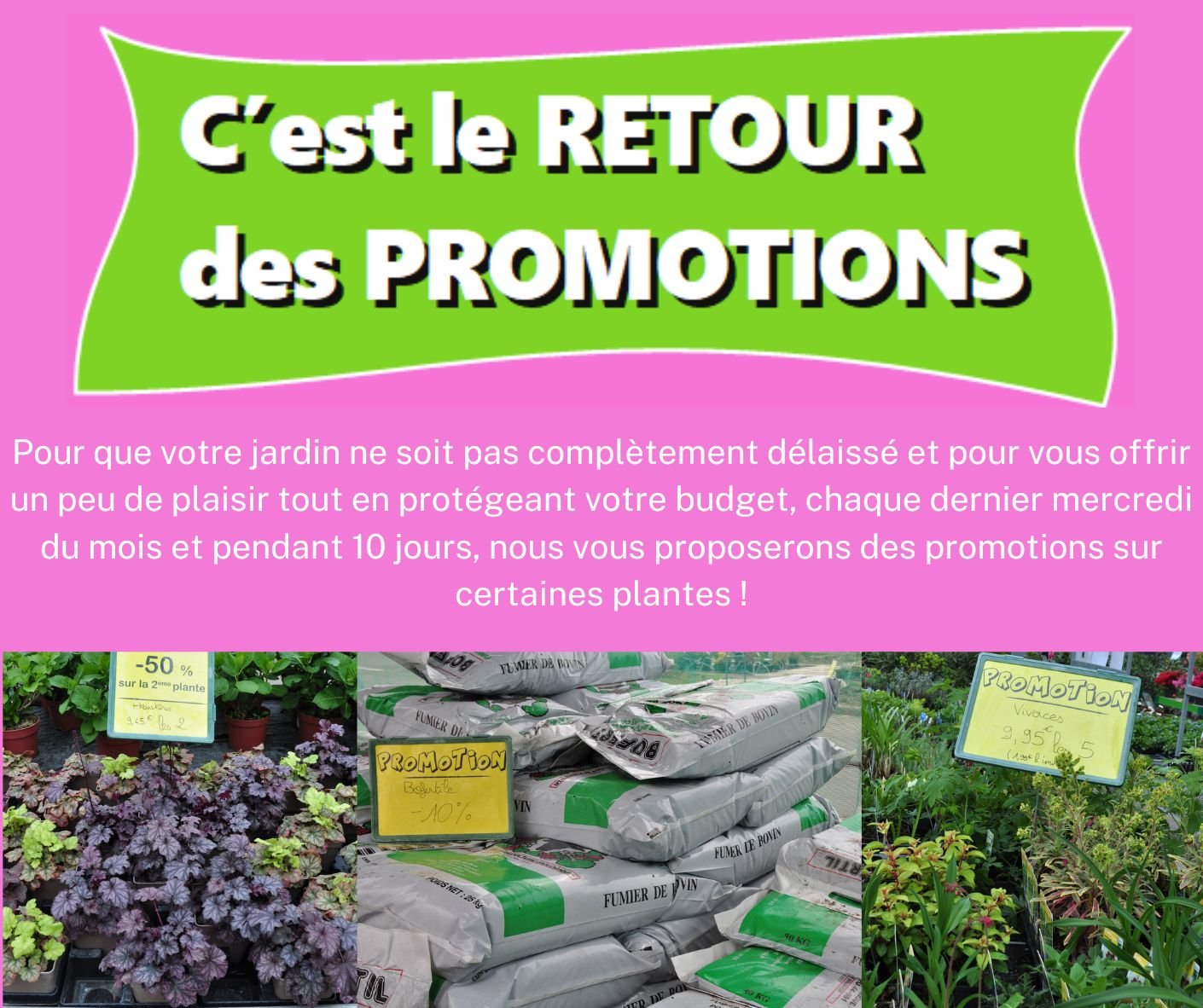 Pour que votre jardin ne soit pas complètement délaissé et pour vous offrir un peu de plaisir tout en protégeant votre budget, chaque dernier mercredi du mois et pendant 10 jours, nous vous proposerons des promotions sur certaines plantes !